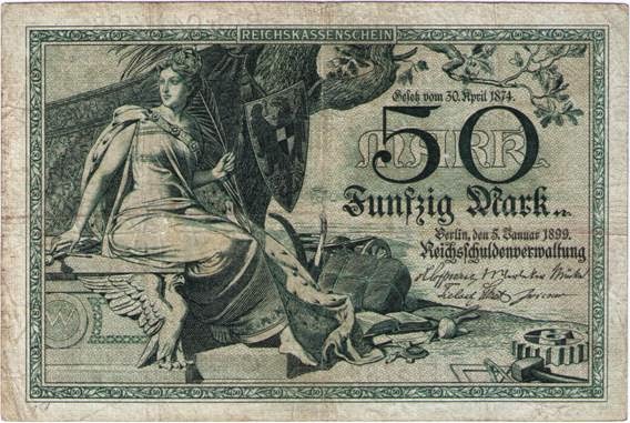 Interessant ist auch der 50er von 1899. Auf der Vorderseite findet man die Germania unter einer Eiche mit verschiedenen allegorischen Symbolen der Industrie, der Kunst, der Wissenschaft, des Handels und der Landwirtschaft ;-); auf der Rückseite ist der gekrönte Reichsadler in Lorbeerzweigen abgebildet.