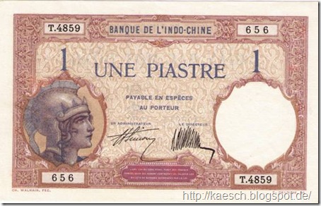 Hier mal wieder was schönes Altes. Von 1921 bis 1931 war der 1 Piastre-Schein im Umlauf, auf dessen Vorderseite die behelmte Marianne abgebildet ist. Die Gesamtauflage betrug 50.000.000 Stück. Hergestellt wurde die Banknoten von der Druckerei Banque De France (Frankreich).